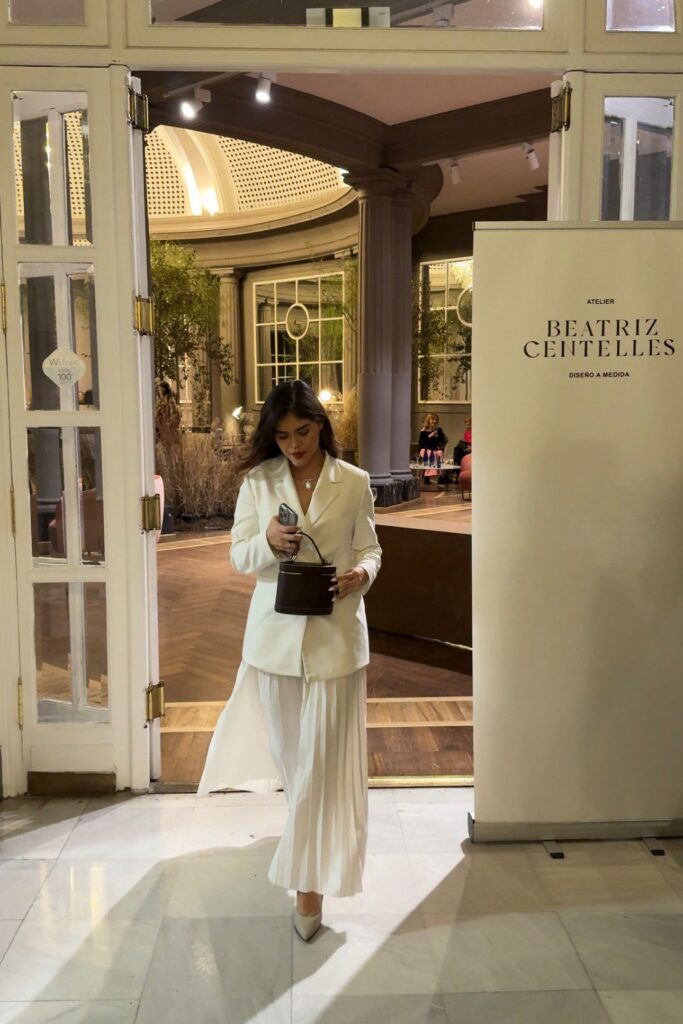 Para acompañar una tarde tan elegante, elegí un look en tonos crudos: un traje de chaqueta blanco con falda plisada. Me sentía yo misma, cómoda y sofisticada, lista para una cita donde la artesanía era la protagonista.